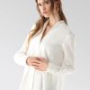The relaxed fit blouse is an elegant and versatile piece of clothing for women. With its simple silk stretch crepe de chine fabric, it is comfortable to wear and has an elegant look. The stand-up collar gives the blouse a modern and stylish touch. Long sleeves are gathered at the back and cuffs for a refined detail. The relaxed fit offers freedom of movement and a relaxed silhouette. Whether in the office or on special occasions, this blouse is a stylish choice.